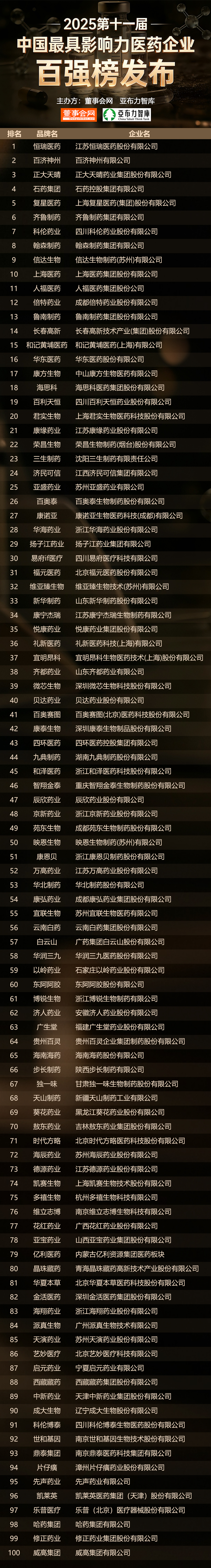2025第十一届中国最具影响力医药企业百强榜名单: