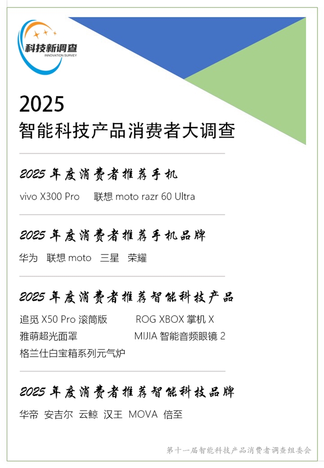 结合大众投票与专业评审,2025年度消费者推荐榜单同期出炉。2025年度消费者推荐手机为vivo X300 Pro、联想moto razr 60 Ultra;2025年度消费者推荐手机品牌为华为、联想moto、三星、荣耀;2025年度消费者推荐智能科技产品为追觅X50 Pro滚筒版、ROG XBOX掌机X、雅萌超光面罩、MIJIA智能音频眼镜 2、格兰仕白宝箱系列元气炉;2025年度消费者推荐智能科技品牌为华帝、云鲸、安吉尔、汉王、MOVA、倍至。