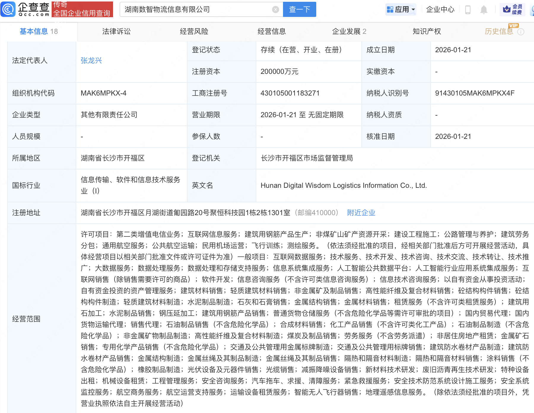 企查查APP显示,近日,湖南数智物流信息有限公司成立,注册资本20亿元,经营范围包含:人工智能公共数据平台;人工智能行业应用系统集成服务;航空商务服务;航空运营支持服务等。企查查股权穿透显示,该公司由现代投资(000900)、湖南省高速公路集团有限公司、湖南钢铁集团有限公司等共同持股。