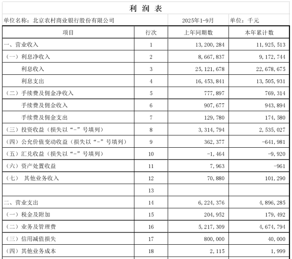 北京农商行2025年三季报显示,报告期末该行全行资产总额突破1.34万亿元,较年初增长7.29%;净利润近59.7亿元,同比增长1.53%。
