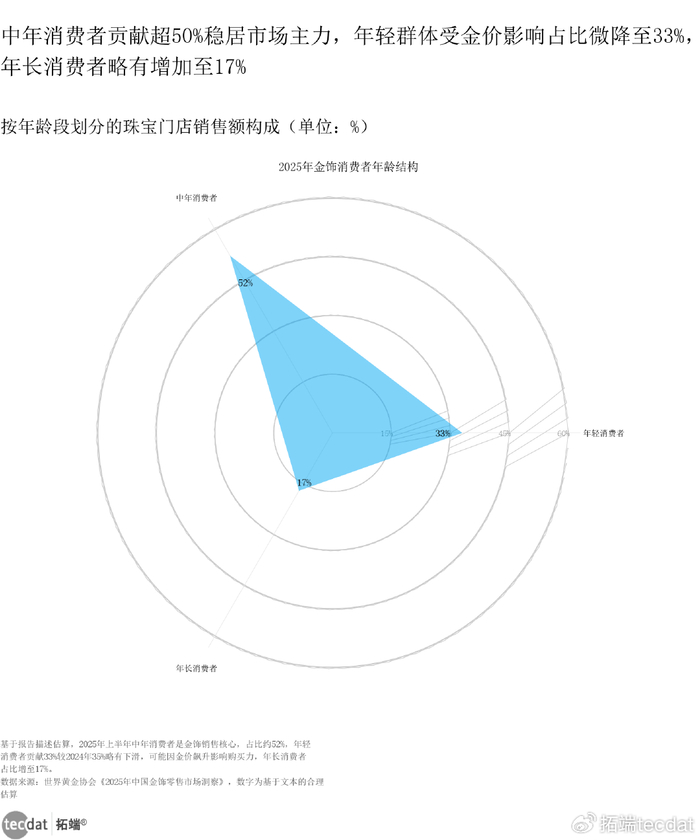 金饰消费场景贡献分组条形图11数据EXCEL及图表PDF模板已分享到会员群3秒解读:金饰消费从“仪式感”转向“日常化”,自戴场景是主要增量。行动建议:金饰品牌可推出轻克重、多材质组合的日常款,适配高频佩戴需求;门店可优化自戴场景的陈列和搭配服务,提升试戴体验。从消费者年龄结构来看,中年消费者仍是金饰市场主力,2025年占比达52%,较2024年微升;年轻消费者占比33%,受金价影响略有下滑;年长消费者占比17%,呈现稳步增加态势。