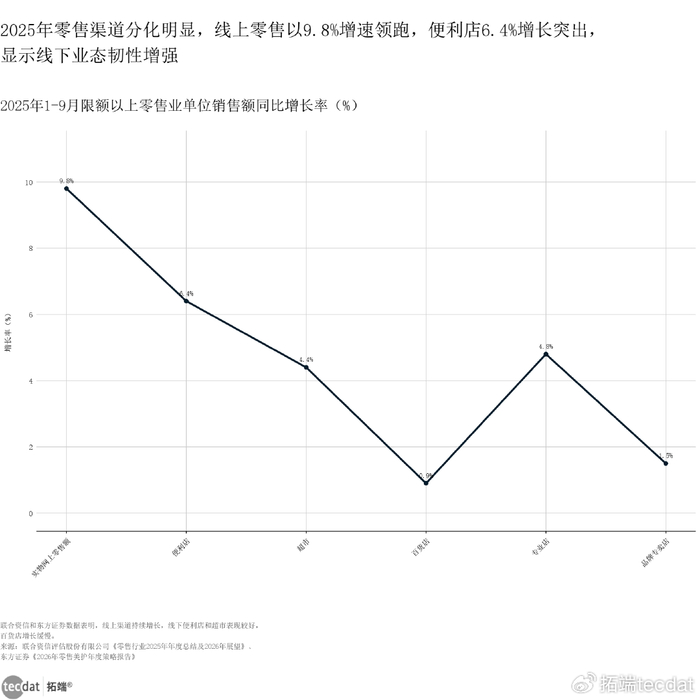 2025年零售渠道分化显著,线上线下各有亮点,“便捷性”与“体验感”成为竞争核心。实物网上零售额以9.8%的增速领跑,便利店凭借6.4%的增长凸显线下业态韧性,超市(4.4%)、专业店(4.8%)稳步增长,而百货店(0.9%)和品牌专卖店(1.5%)增长相对缓慢。