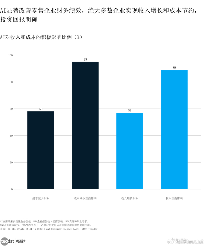 零售业AI应用部署状态饼图1数据EXCEL及图表PDF模板已分享到会员群3秒解读:AI是零售企业穿越周期的核心竞争力,未布局者将面临被边缘化风险。行动建议:线下门店可优先试点AI收银、库存管理工具,快速提升基础效率;品牌方可测试AI智能客服,缩短客户响应时长。AI的价值已直接体现在财务报表上:89%的企业反馈AI对收入产生正向影响,其中57%实现5%以上的收入增长;成本端表现更超预期,95%的企业通过AI降低成本,58%的企业成本降幅超5%。这种“增收+降本”的双重效应,让AI成为零售企业抵御市场波动的关键杠杆。