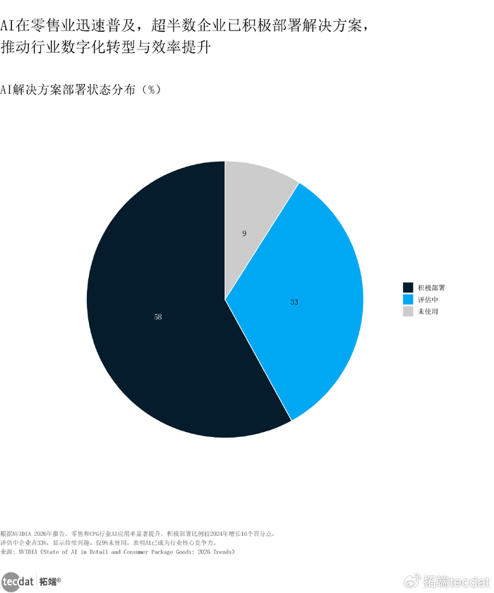 2025年,AI已成为零售企业的“生存必备项”,而非“可选项”。从行业部署现状来看,超半数企业已主动拥抱AI——积极部署的企业占比达58%,较2024年提升16个百分点,33%的企业处于评估试点阶段,仅9%仍未启动AI布局,这一趋势在零售与快消领域尤为突出。