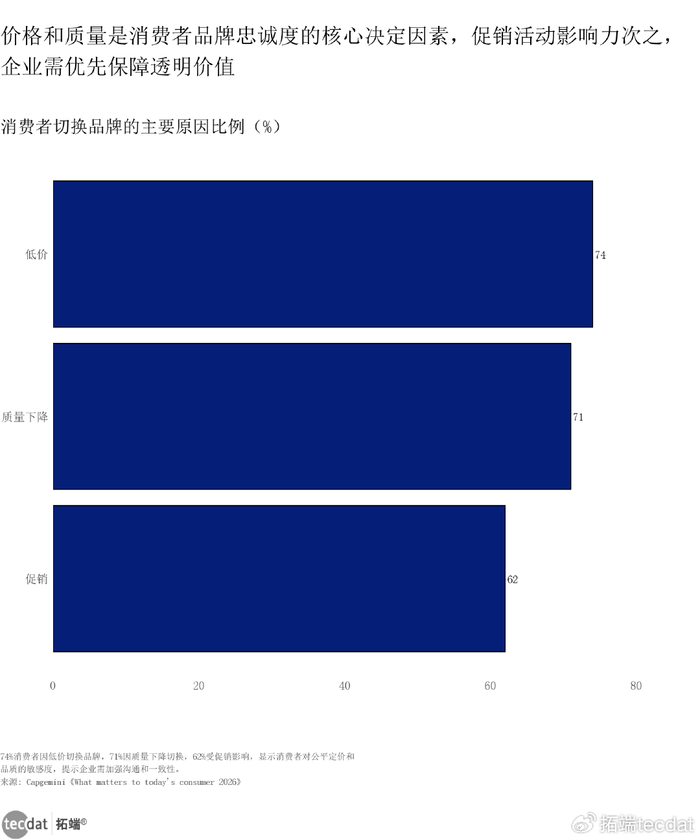 消费者的品牌忠诚度正在被重新定义,“性价比+情绪满足”成为核心决策逻辑。数据显示,74%的消费者会因低价转向其他品牌,71%会因质量下降放弃原有品牌,62%会受促销活动影响改变选择——这意味着理性考量仍是基础,而情绪价值则成为加分项。