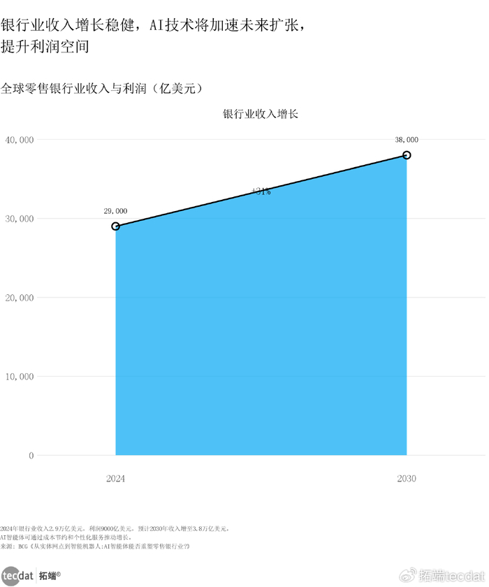消费者对AI助手使用和态度条形图4数据EXCEL及图表PDF模板已分享到会员群3秒解读:“可控的AI便利”是消费者核心诉求,隐私保护是信任前提。行动建议:银行在部署AI理财助手时,需明确数据使用范围并主动公示;电商平台AI推荐需提供手动关闭选项,尊重用户选择权。零售银行业也在AI驱动下迎来深刻变革。2024年全球零售银行业收入达2.9万亿美元,税前利润约9000亿美元,预计2030年收入将增至3.8万亿美元——AI智能体通过成本节约和个性化服务,成为利润提升的关键变量。