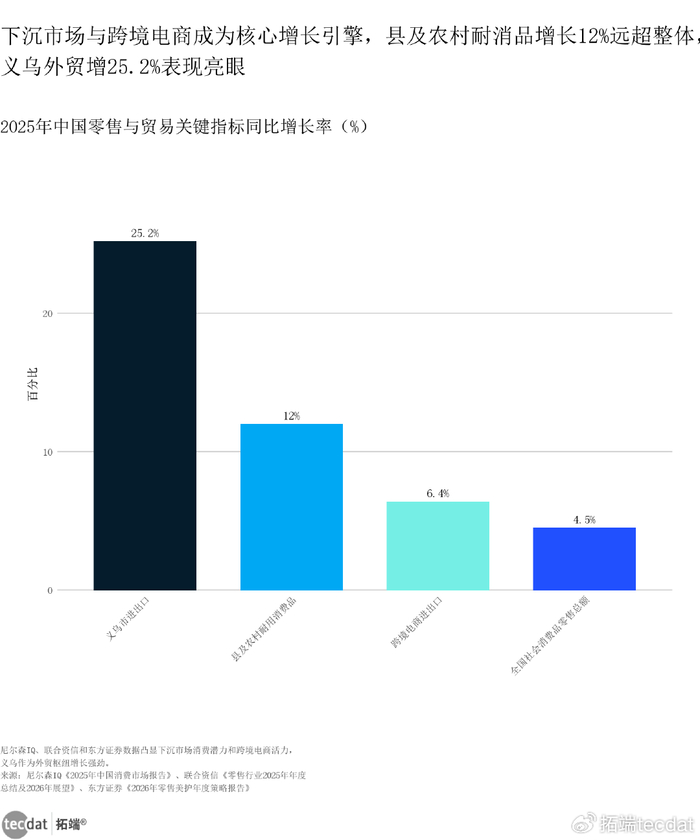 零售渠道销售额增长率条形图7数据EXCEL及图表PDF模板已分享到会员群3秒解读:线上仍保持增长势能,线下便利店是突围关键,传统百货需加速调改。行动建议:美妆品牌可重点布局便利店即时零售,覆盖“即时性美妆需求”;超市可推进“生鲜+折扣”模式调改,参考重庆百货经验提升周转率。下沉市场与跨境电商成为核心增长引擎。县及农村耐用消费品增长率达12%,远超全国社会消费品零售总额4.5%的增速;跨境电商进出口增长6.4%,义乌市进出口更是以25.2%的高增速领跑,成为外贸枢纽的典型代表。