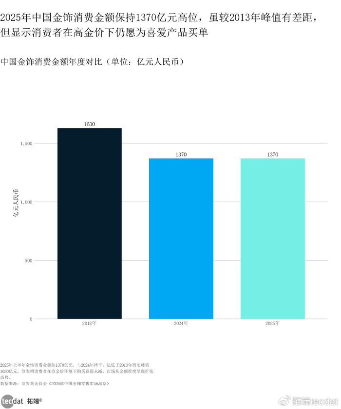 中国化妆品市场规模预测条形图9数据EXCEL及图表PDF模板已分享到会员群3秒解读:国货在化妆品赛道的话语权持续提升,成分创新是破局关键。行动建议:国货美妆可加大植物提取、生物发酵技术研发,打造差异化优势;线下门店可增加国货试用场景,强化消费者体验。金饰市场在高金价环境下仍保持韧性,2025年消费金额稳定在1370亿元,与2024年持平,虽低于2013年1630亿元的历史峰值,但消费者购买意愿未减。消费场景发生显著变化:自戴场景占比从2024年的27%升至2025年的37%,成为核心驱动力;婚庆场景占比从24%降至19%,反映消费个性化趋势。