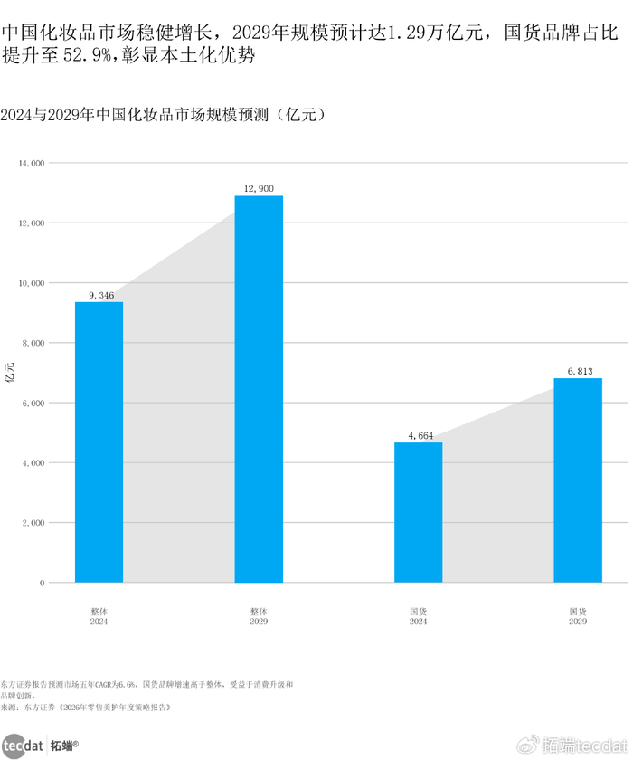 零售与贸易关键指标增长率条形图8数据EXCEL及图表PDF模板已分享到会员群3秒解读:下沉市场消费潜力释放,跨境电商活力十足,是未来增量核心。行动建议:家电品牌可推出适配县域的高性价比智能产品,贴合下沉市场需求;快消品牌可借助义乌供应链资源,布局TikTokShop等内容电商平台,优先切入毛绒玩具、美妆工具等优势品类。化妆品市场呈现“整体增长,国货崛起”的鲜明态势。2024年整体市场规模达9346亿元,预计2029年增至1.29万亿元,五年CAGR为6.6%;国货品牌表现更优,2024年规模4664亿元,2029年将达6813亿元,占比提升至52.9%,本土化创新成为核心竞争力。