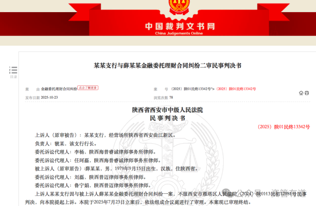 近日,据资管行业人士提示,资管有道查询中国裁判文书网发现,2025年10月公布的一则二审民事判决书披露,投资者薛某某在某银行西安某支行投入100万元购买代销资管产品,最终本金仅收回1.9万余元,亏损超98万元。薛某某诉至法院。