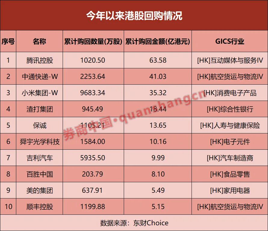 数据显示,2026年以来,腾讯控股回购了1020.50万股,回购金额达63.58亿港元;中通快递回购了2263.6万股,回购金额41.03亿港元;小米集团回购了9683.3万股,回购金额35.32亿港元;渣打集团、保诚、舜宇光学科技、吉利汽车、百胜中国、美的集团和顺丰控股跻身回购前十名,回购金额均超过5亿港元。
