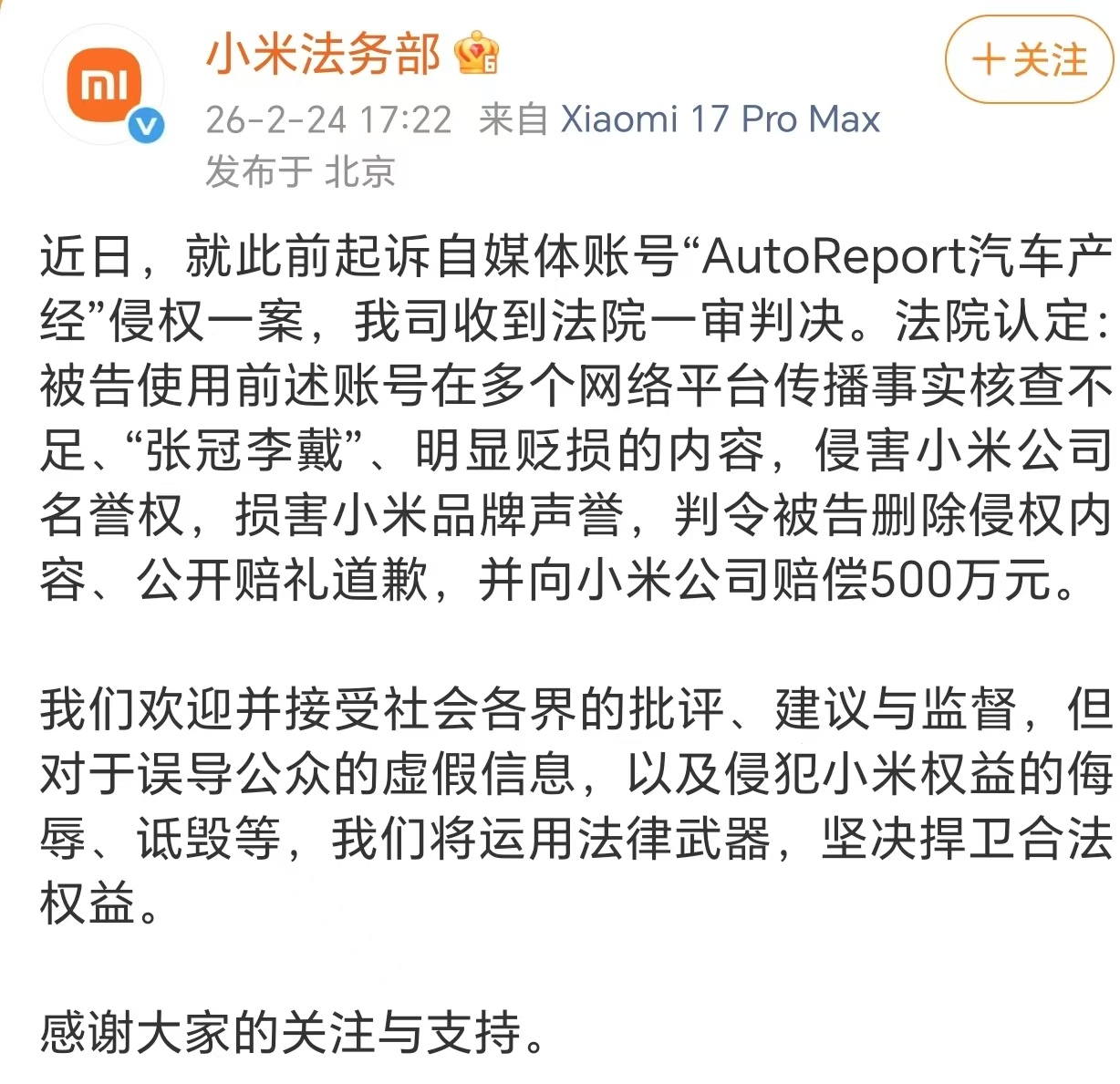 2月24日,小米法务部发文称,近日,就此前起诉自媒体账号“AutoReport汽车产经”侵权一案,公司收到法院一审判决。法院认定:被告使用前述账号在多个网络平台传播事实核查不足、“张冠李戴”、明显贬损的内容,侵害小米公司名誉权,损害小米品牌声誉,判令被告删除侵权内容、公开赔礼道歉,并向小米公司赔偿500万元。