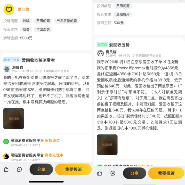 涉及“回收平台”的投诉量惊人,大量指向“恶意压价”