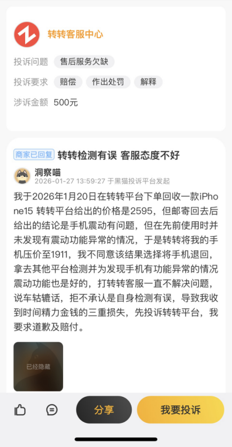 有消费者反映,其在2026年1月通过转转回收一台iPhone 15,平台预估价格为2595元,但邮寄质检后却称“手机震动功能有问题”,将价格下调至1911元。消费者选择退回手机,并在其他平台检测,发现震动功能完全正常。