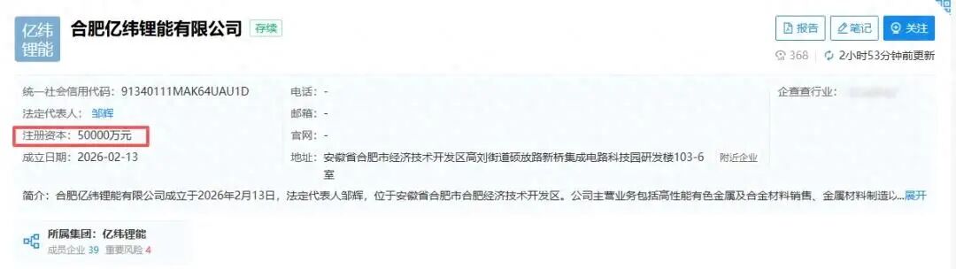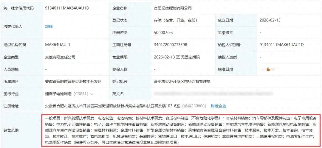 日前,合肥亿纬锂能有限公司注册成立,据悉,该公司由惠州亿纬锂能股份有限公司全资持股,注册资本5亿元,法定代表人为邹辉,注册地址位于安徽省合肥市经济技术开发区。