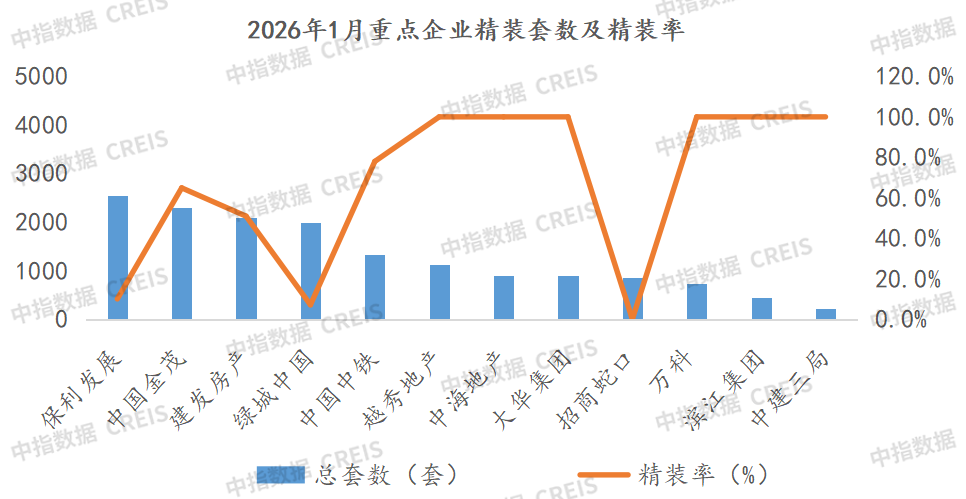 2026年1月,越秀地产、中海地产、大华集团等企业商品住宅房源开盘精装率最高,均达100%;保利发展精装修房源规模量最高,达2544套,其次是中国金茂和建发房产,精装修房源套数均超过2000套。