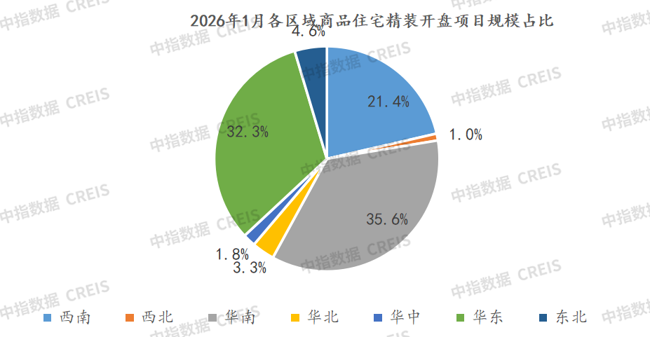 2026年1月,全国重点监测300城住宅精装修楼盘平均精装率为21.83%,比去年同期提升4.65个百分点。其中一线城市、二线城市、三四线城市平均精装率分别为75.6%、30.7%和5.9%,较去年同期分别下降17.67个,提高0.32和1.34个百分点。华南平均精装率最高,达43.3%。