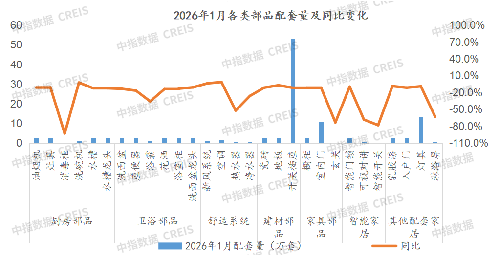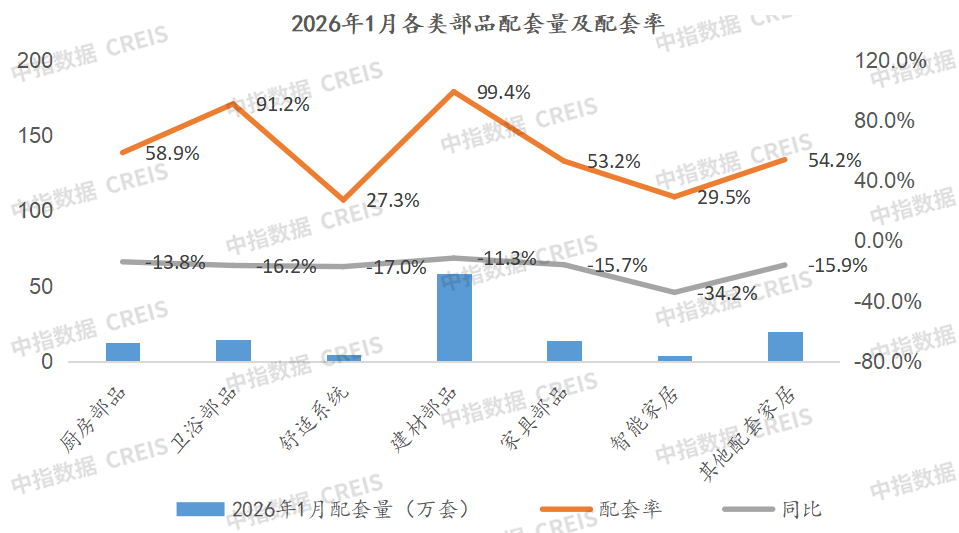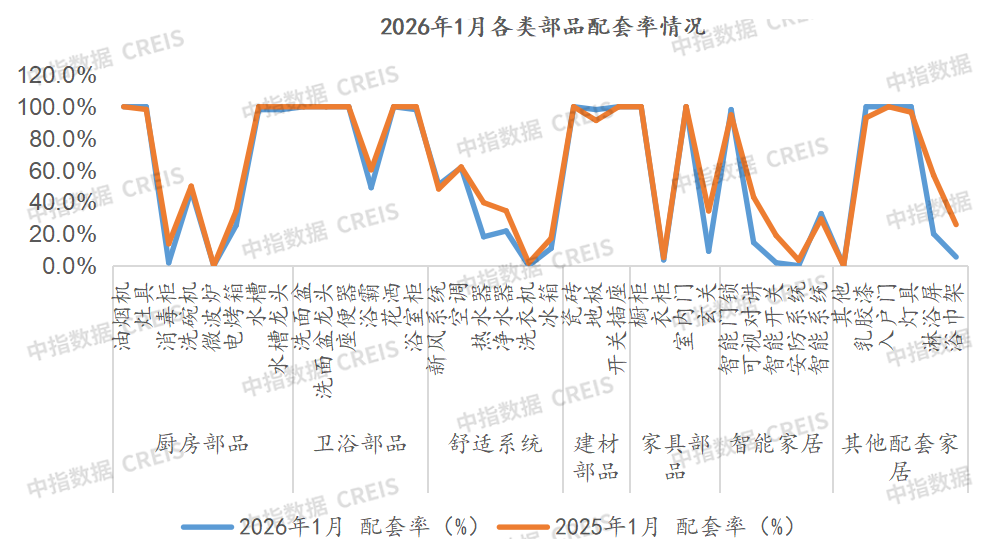 2026年1月,乳胶漆、智能系统、灯具、地板、智能门锁等配套率小幅提升;部分部品配套率大幅下降,包括热水器、玄关、可视对讲、淋浴屏、浴巾架等降幅超过20个百分点。