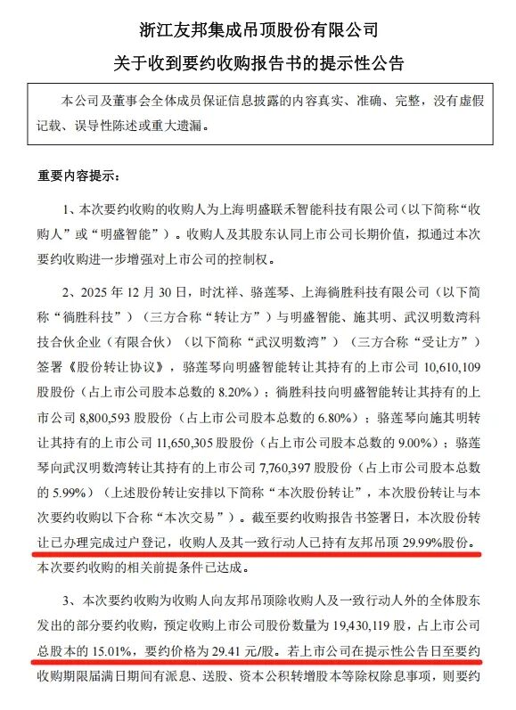 公告还显示,明盛智能此前已与友邦吊顶实控人时沈祥、骆莲琴夫妇及其控制的徜胜科技签署协议,受让公司合计29.99%的股份,转让价格为29.41元/股。本次要约收购完成后,明盛智能合计持股比例将达45%,成为友邦吊顶新控股股东。