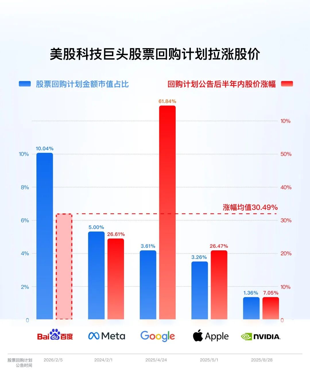 先是 50 亿美元的股票回购,这笔钱,差不多是百度市值的 10%。横向比比就知道这力度有多大:苹果、谷歌这类现金流顶流的公司,回购比例通常也就 2%-4%,就算是风格激进的 Meta,高点时也才 5%。百度敢拿出市值的 10%来回购,意思再明显不过:市场把公司估低了,当前的股价,至少还有 10%以上的修复空间。