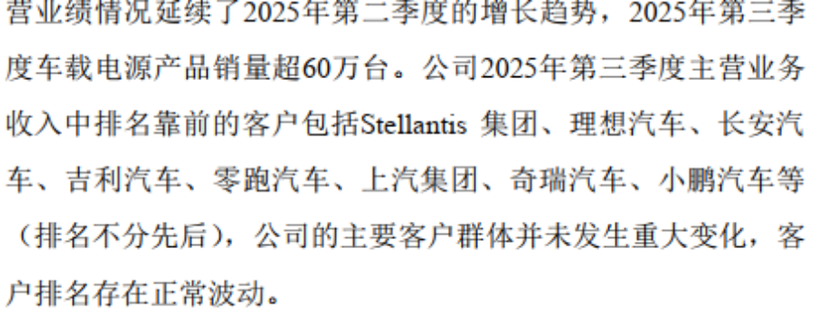 市场拓展方面,公司持续获得国内外主流客户定点,除小鹏、理想、岚图等国内品牌外,还新增吉利、零跑、上汽等重要客户的800V新项目定点,同时还打入了Stellantis、雷诺等国际品牌的供应链体系。这也是公司当前主要的客户群。