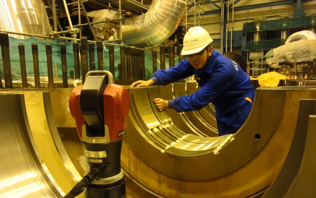 传统汽轮机通流间隙测量的“压铅丝”工艺,需反复吊装180吨转子和百余吨汽缸,强度大、风险高、耗时长,由中广核运营自主研发的激光测通流技术,采用汽缸转子分离测量法,通过激光定位精准获取坐标,无需吊装转子,即可高精度(0.02毫米)计算内部间隙,检修工期从半个月缩短至4天,作业风险大幅降低。