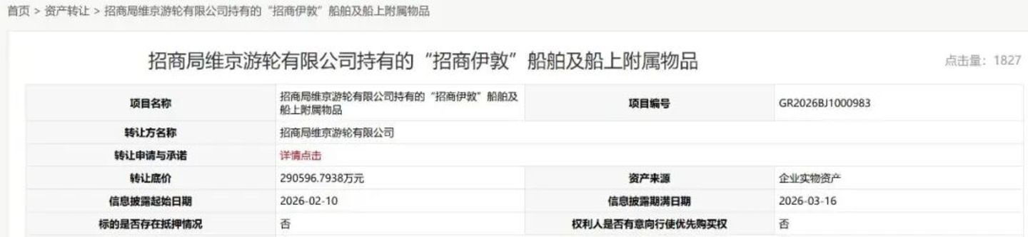 闻旅查询北京产权交易所公开信息发现,招商局维京游轮有限公司旗下“招商伊敦”号船舶及相关船上附属资产已正式挂牌转让,底价:29.05967938亿元人民币。