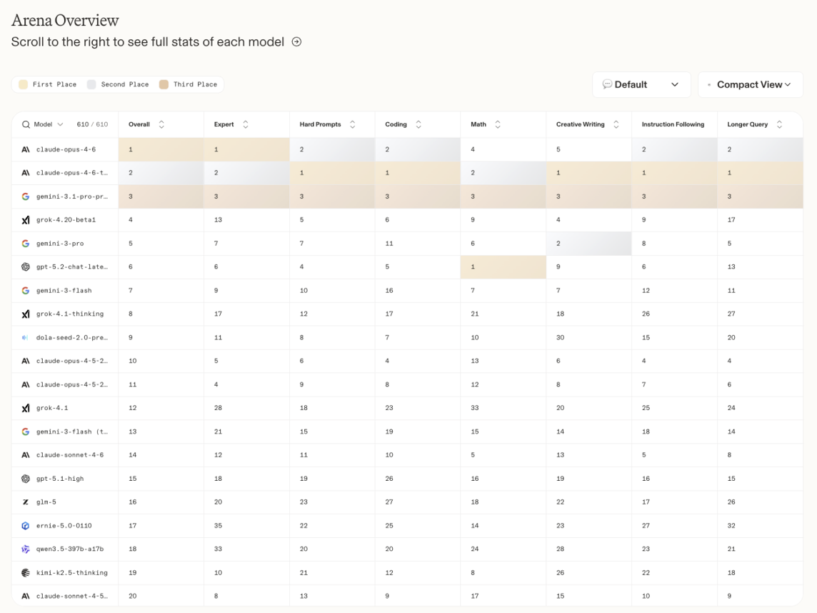 本次 LMArena 综合榜单头部席位仍由国际主流大模型占据,榜单前三依次为 claude-opus-4-6、gemini-3.1-pro-pr、grok-4.20-beta1;国产阵营中,字节跳动的豆包2.0位列综合榜单第9位,是唯一进入全球前十的国产大模型。