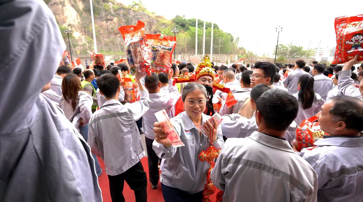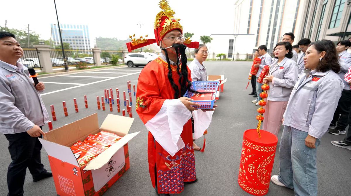 正月初八,汇兴智造开工当日,财务总监穿着财神爷服饰,挨个给员工派发旺旺大礼包和红包。笑声与机器声交织,年味尚未散去,生产已经拉满。