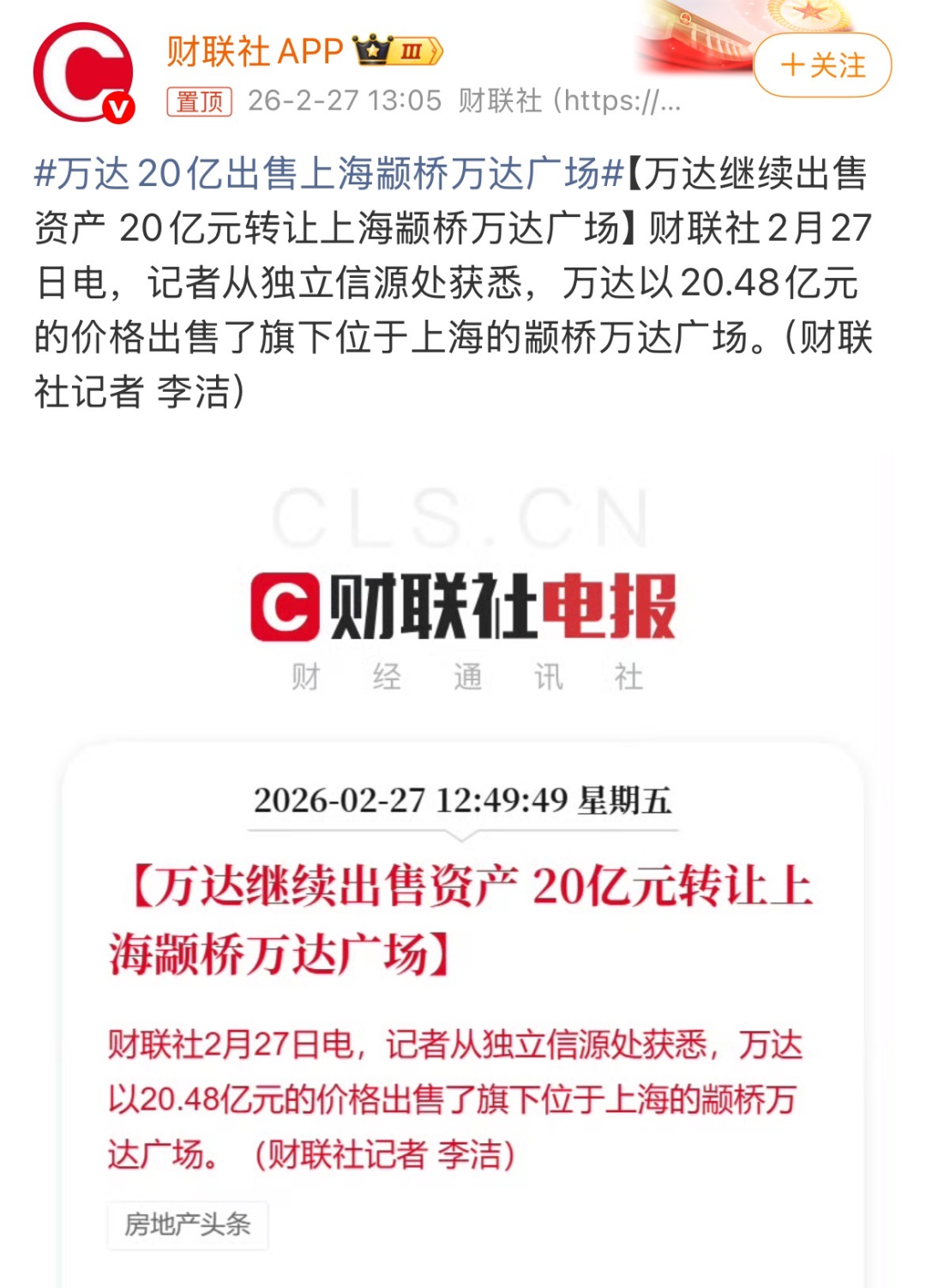 财联社近日消息,万达以20.48亿元的价格出售了旗下位于上海的颛桥万达广场。