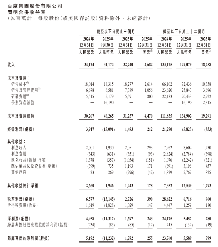 百度集团(09888.HK,BIDU)于周四(2月26日)公布了2025年第四季度及全年业绩公告。