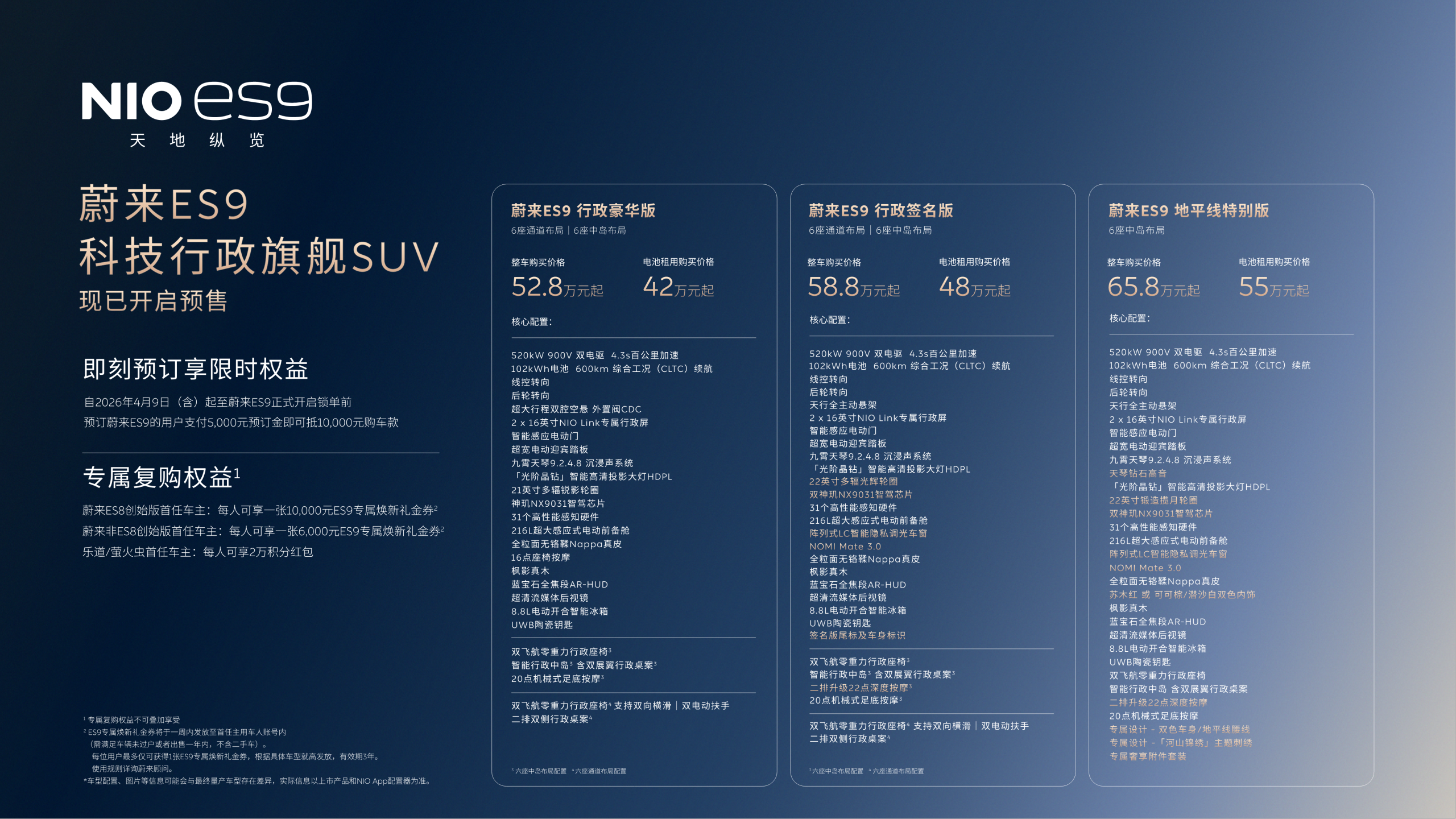 自2026年4月9日(含)起至正式上市发布前,预订蔚来ES9的用户,将享受限时预订权益,支付5,000元预订金,可抵扣10,000元购车款。蔚来还为老用户提供了ES9的专属复购礼遇:蔚来ES8创始版首任车主可享10,000元ES9专属焕新礼金券,蔚来非ES8创始版首任车主可享6,000元ES9专属焕新礼金券;乐道、萤火虫首任车主每人可享2万复购积分红包。