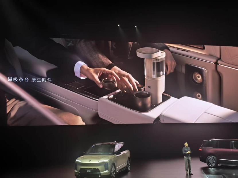 不少行业首发出现在ES9上,包括飞书App首次上车,也包括足底按摩等新功能,甚至有了磁吸茶台。这意味着车上既可以开视频会议,也可以车内约会品茗。