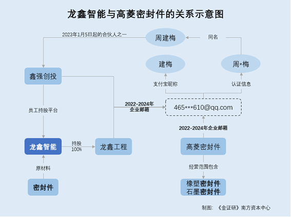 据市场监督管理局数据,2022-2024年,龙鑫工程及鑫强创投的企业联系邮箱均为“465***610@qq.com”。其中,2023年1月5日,周建梅新增成为鑫强创投的合伙人之一。