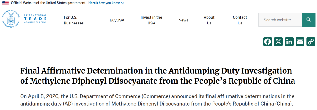 2026年4月8日,美国商务部发布反倾销肯定性终裁公告。