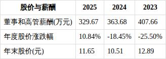 近三年董事和高级管理人员薪酬方面,2023年薪酬总额为407.66万元,2024年薪酬总额为363.68万元,2025年薪酬总额为329.67万元。从2023年到2025年,董事和高管薪酬总额减少77.99万元,降幅19.13%。