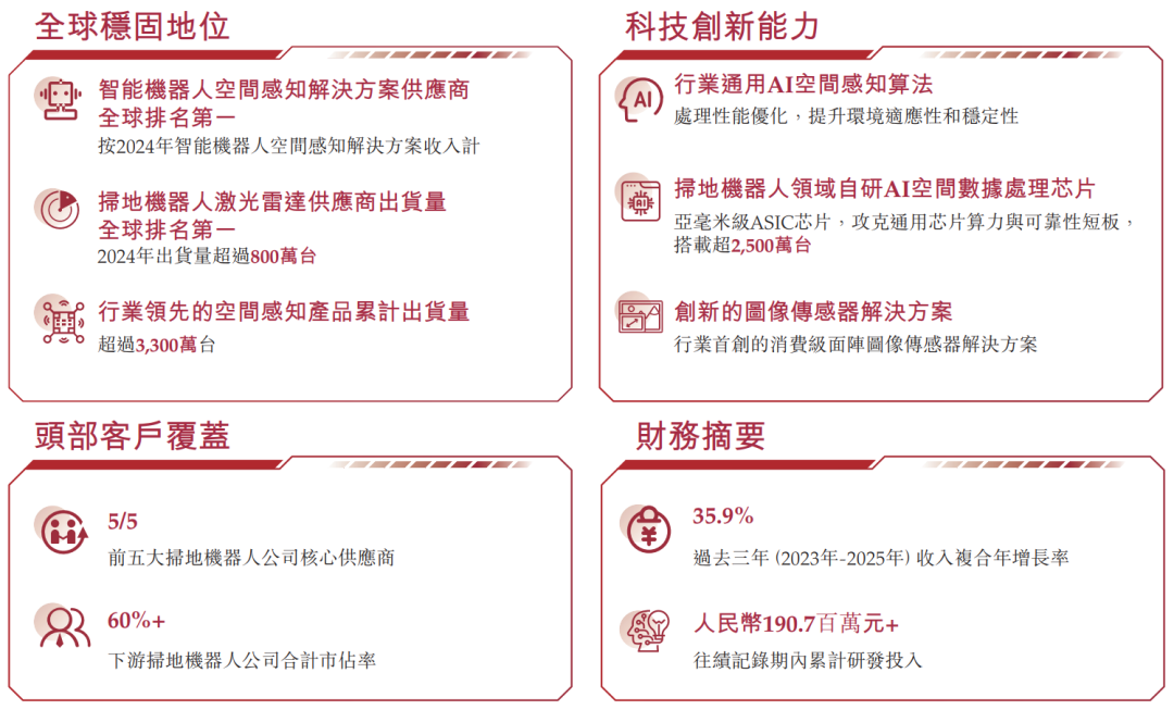 公司是智能机器人行业内少数同时拥有自研亚毫米级AI空间数据处理芯片设计和核心空间感知AI算法能力的企业之一。通过独创的消费级CIS加自研ASIC芯片技术方案,公司重新定义了机器人空间感知技术的成本效率边界,实现了更低的成本优势、更高的定位精度及商业可扩展性。