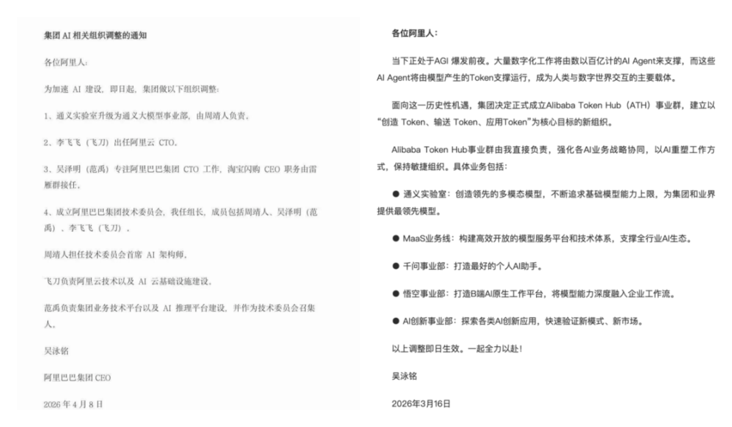 4月8日,阿里CEO吴泳铭签发了三周内的第二封全员信。如果说3月16日ATH事业群的成立是一次圈地运动,把散落在各处的AI资产用Token的逻辑重新装进一个篮子,那么这封信就是分田到户,给每个关键环节钉上一个名字。