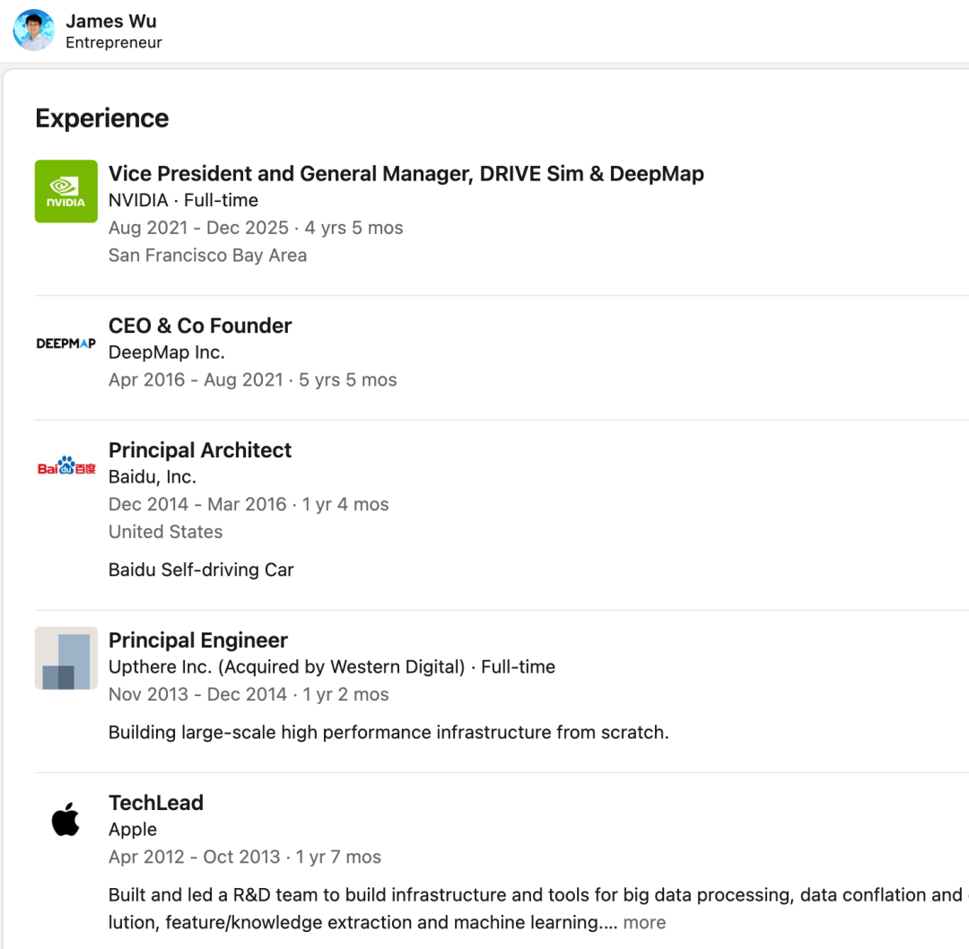 加入英伟达后,吴夏青主导了 DRIVE Sim&Deep Map 业务部门,并担任副总裁兼总经理,深度参与英伟达在自动驾驶仿真与高精地图领域的业务布局。