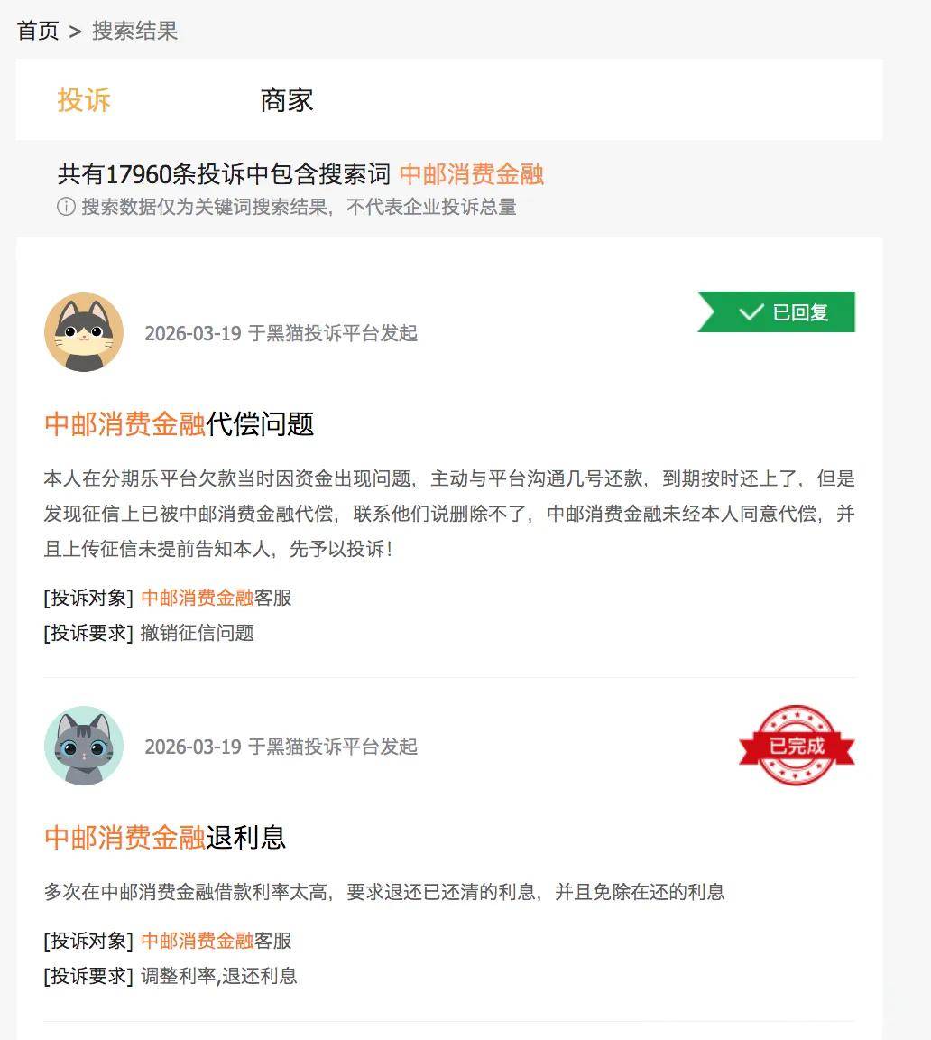 在追求规模扩张的同时,中邮消金的合规内控却显得薄弱不堪。黑猫投诉平台上的数据触目惊心,截至3月30日,截至3月30日,中邮消金在黑猫投诉平台的累计投诉量超1.7万件,近30日投诉量达265件;其中,仅针对中邮钱包的投诉就达1112条,“暴力催收”“超额收费”成为投诉高频词条。