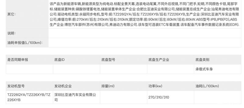 申报信息显示该车提供单电机和三电机两种动力,单电机版电机功率为370千瓦,三电机版电机总功率达到890千瓦。电池和充电方面,该车很可能搭载比亚迪刚刚发布的第二代刀片电池以及最新的闪充技术。