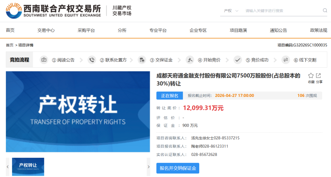 近日,成都天府通金融支付股份有限公司(下称“天府通”)7500万股股份(占总股本的30%)挂牌转让,转让底价为1.21亿元,挂牌截止日期为4月27日。截至发稿,该笔股权暂无买家报名。