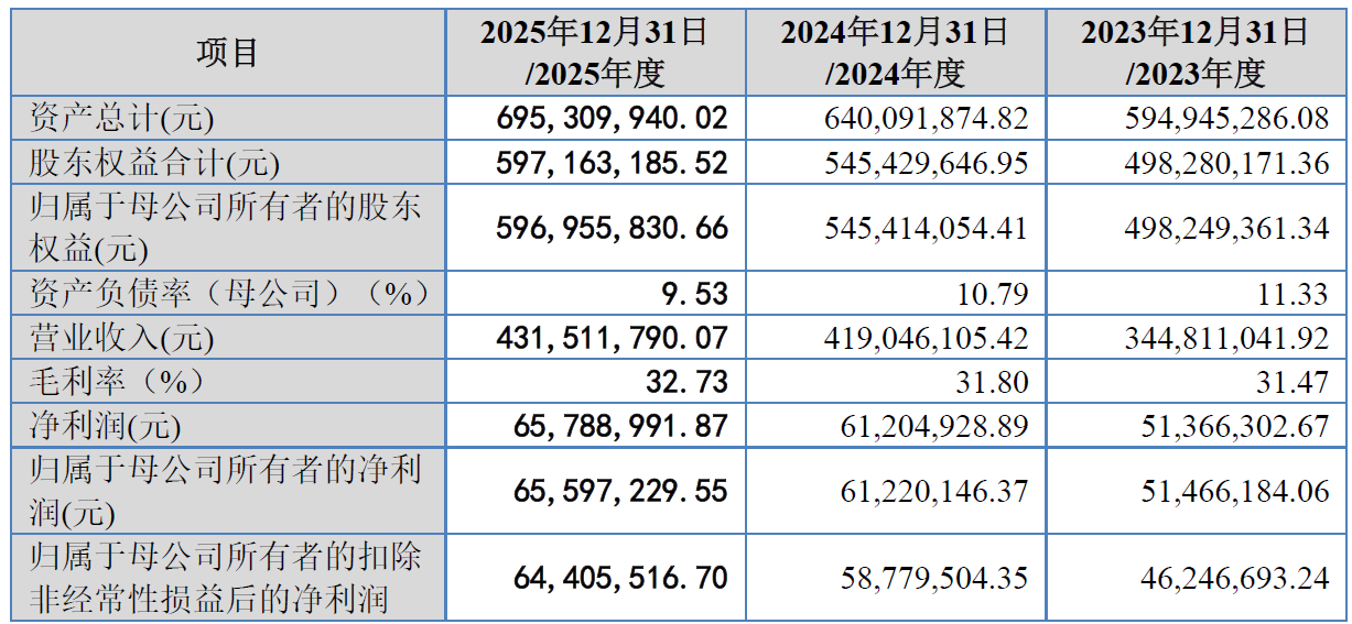 从财务数据来看,2023-2025年,创达新材营业收入从3.45亿元增长至4.32亿元,归母净利润从5,147万元增长至6,560万元,呈现稳健增长态势。公司的盈利能力也相当出色,综合毛利率连续三年保持在31%以上,2025年达到了32.73%。