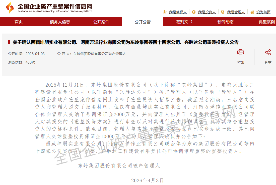 2026年4月3日,全国企业破产重整案件信息网发布的公告显示,西藏坤朋实业公司(以下简称西藏坤朋)、河南万洋锌业有限公司(以下简称河南万洋锌业)联合体正式成为东岭集团等44家公司、宝鸡兴胜达工程建设公司重整投资人。