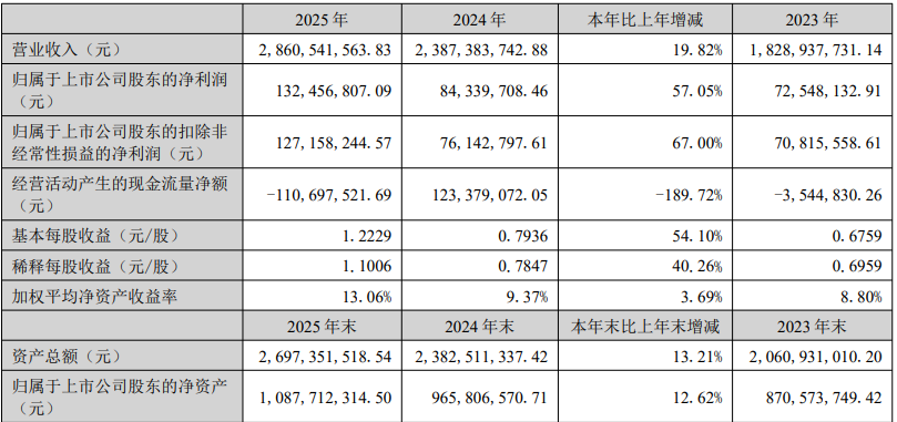 2025年,南京聚隆业绩创下历史新高。全年实现营业收入28.61亿元,同比增长19.82%;归属于上市公司股东的净利润1.32亿元,同比大幅增长57.05%,增速远超营收,盈利质量显著提升。