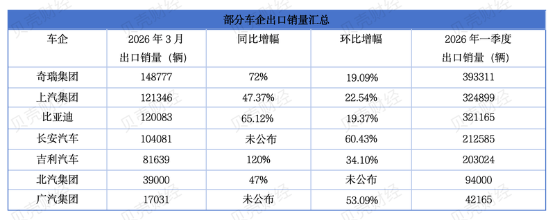 这股海外需求热潮,在今年3月中国汽车出口数据中体现得尤为明显。乘联分会4月9日发布的数据显示,今年3月乘用车出口(含整车与CKD)69.5万辆,同比增长74.3%,环比增长25.2%。其中新能源车占出口总量的50.2%,较2025年同期增加14个百分点。奇瑞、上汽、比亚迪3月出口销量领跑,均超过12万辆。
