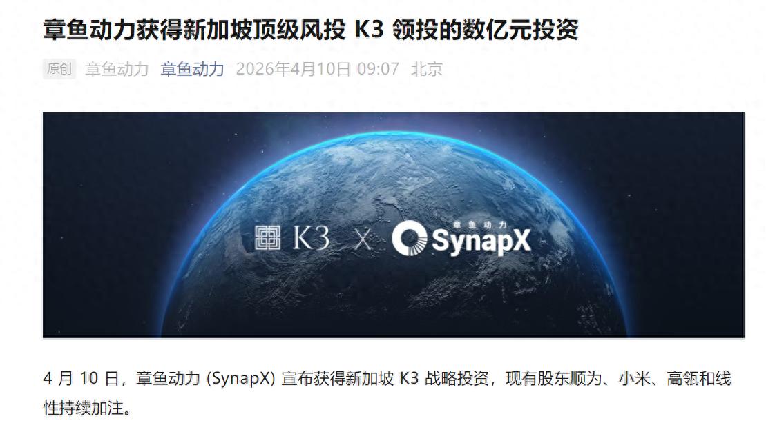 瑞财经王敏 4月10日,北京章鱼灵动科技有限公司(以下简称“章鱼动力)宣布获得新加坡K3战略投资,现有股东顺为、小米、高瓴和线性持续加注。