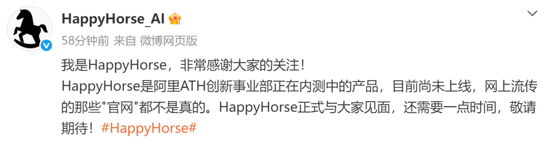 HappyHorse官方微博表示,HappyHorse是阿里ATH创新事业部正在内测中的产品,目前尚未上线。同时提醒,网上流传的那些“官网”都不是真的,HappyHorse正式与大家见面,还需要一点时间。