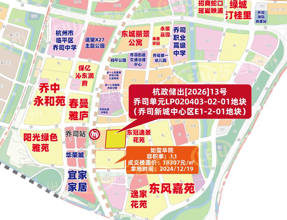 杭政储出[2026] 13号地块,即乔司单元LP020403-02-01地块(乔司新城中心区E1-2-01地块),容积率1.5,建筑密度不大于35%、建筑高度不大于23米,是典型的低密宅地。