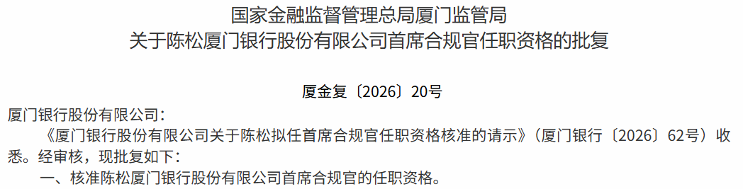近日,厦门金融监管局公布批复,核准陈松厦门银行首席合规官的任职资格。